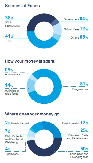 SOS Children’s Villages India has been a strong advocate of the concerns, rights, and needs of parentless and abandoned children in the country for the last six decades and the organisation’s high standards of accountability and transparency are reflected through the clear distribution of funds it receives from its donors, friends and corporate partners. All these years, our work has been supported extensively by donations from abroad. With the recession in Europe and the USA, foreign donations are on the decline. Since we are a self-implementing NGO unlike other large NGOs and we provide long-term care to abandoned children over a period of 24 years, we need sustained support.